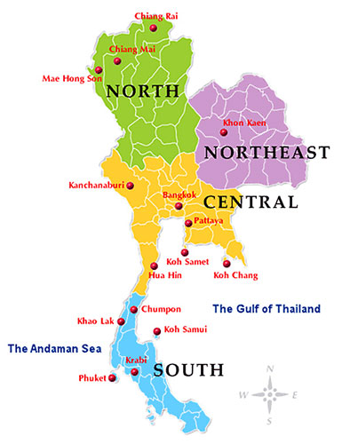הצפון: אזור צפון תאילנד המוקף בהרים הגבוהים ביותר במדינה, ידוע בנופים ירוקים, משולש הזהב, טרקים יפים, טיולי ג'יפים, מקדשים, תרבות שבטית, שווקים וספורט אתגרי. העיר הגדולה ביותר באזור היא צ'יאנג מאי, עיר יפהפייה שמהווה אבן שואבת בפני עצמה.